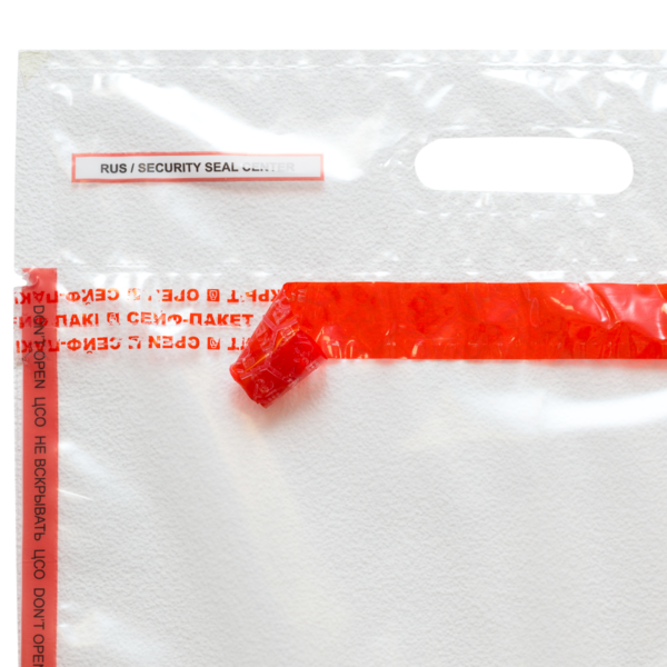 Пакет оснащен пломбировочной сейф-лентой, которая при попытке несанкционированного вскрытия необратимо проявляет контрольные надписи «ВСКРЫТО», «OPEN», «СТОП», «STOP». Конструкция предусматривает усиленную ручку, а также символику ИКАО и специальную маркировку, выполненную по стандарту ИКАО (RUS/Security Seal Center), подтверждающую подлинность и происхождение товара.